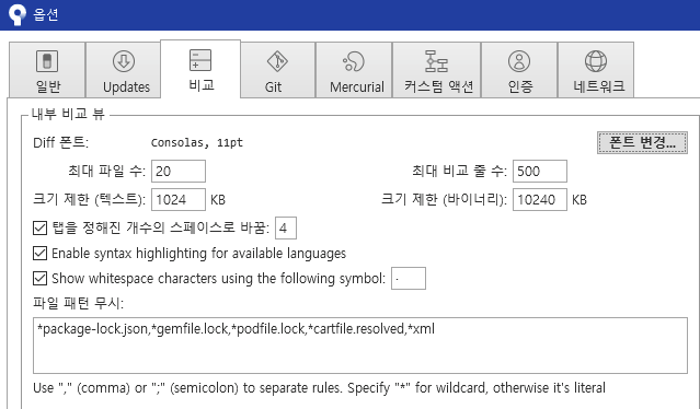 이곳에서 파일 패턴 무시 항목에